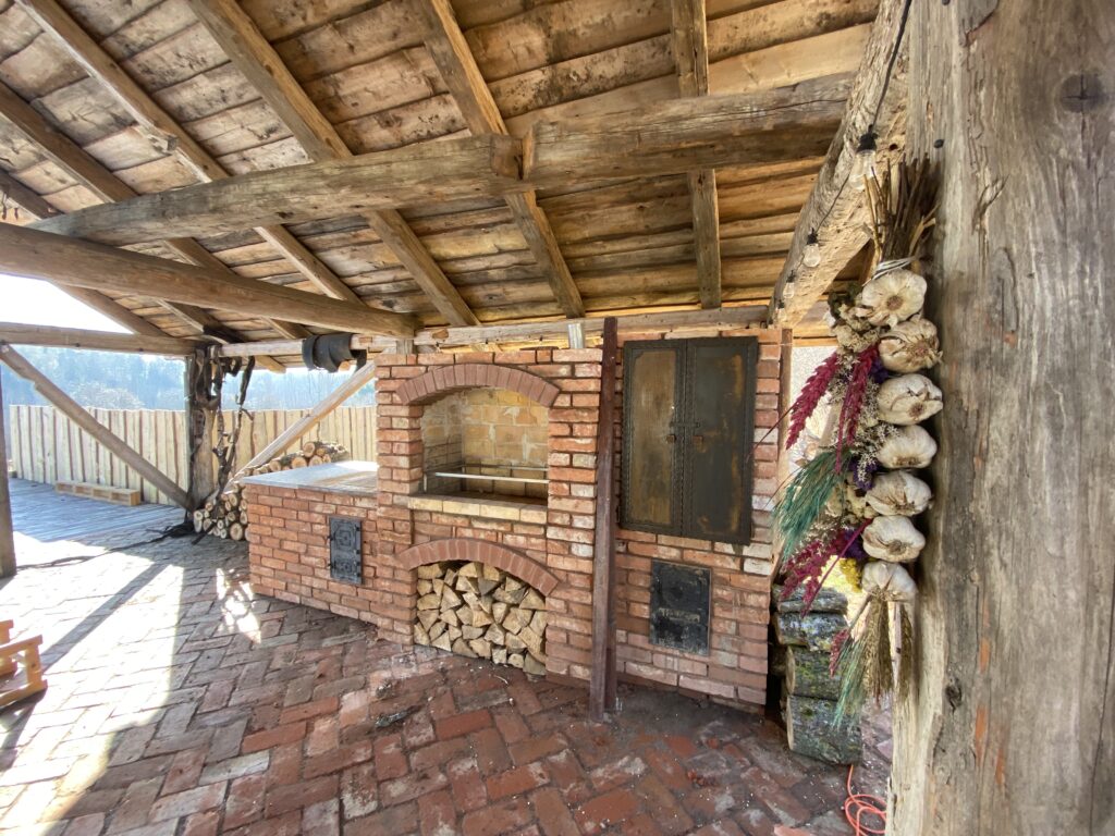 Na terenie naszego obiektu znajduje się przestronny, zadaszony taras z grillem, piecem do gotowania oraz wędzarnią i dużym stołem do biesiadowania.